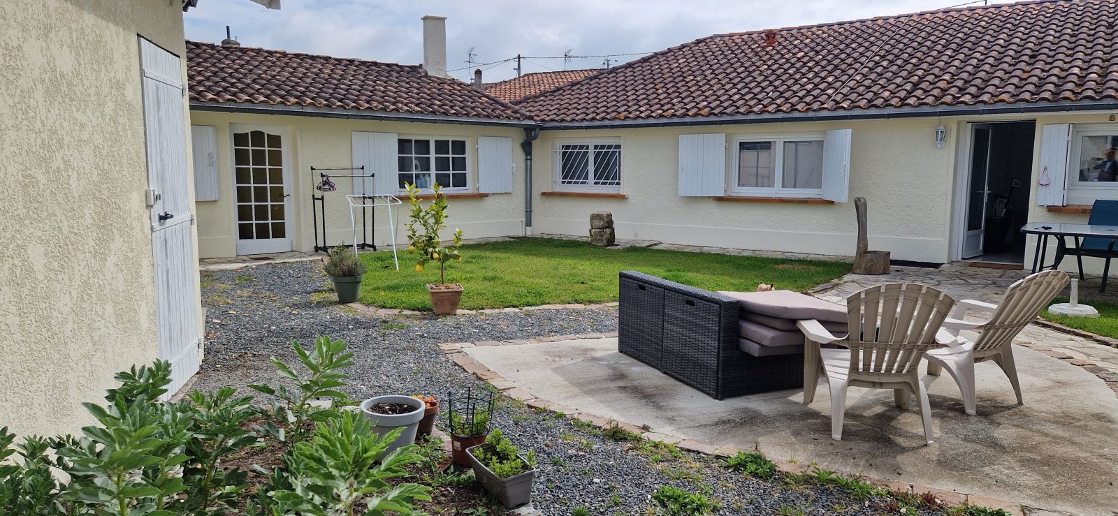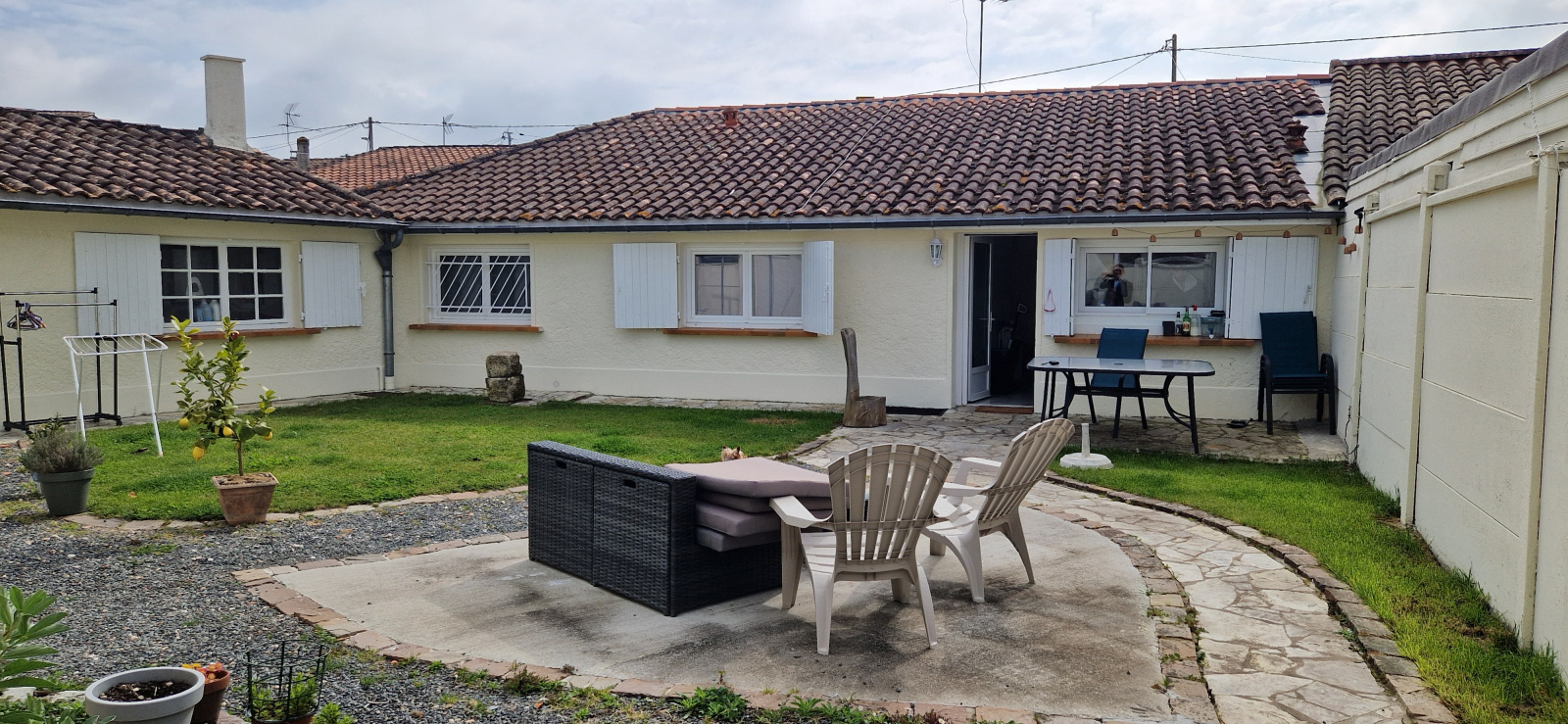 maison ancienne rénovée comprenant, séjour, cuisine équipée, dégagement, deux chambres, salle de bains avec douche et baignoire, WC, dépendance attenante comprenant, une salle de sport, buanderie, grand garage, terrasse et jardin clos.