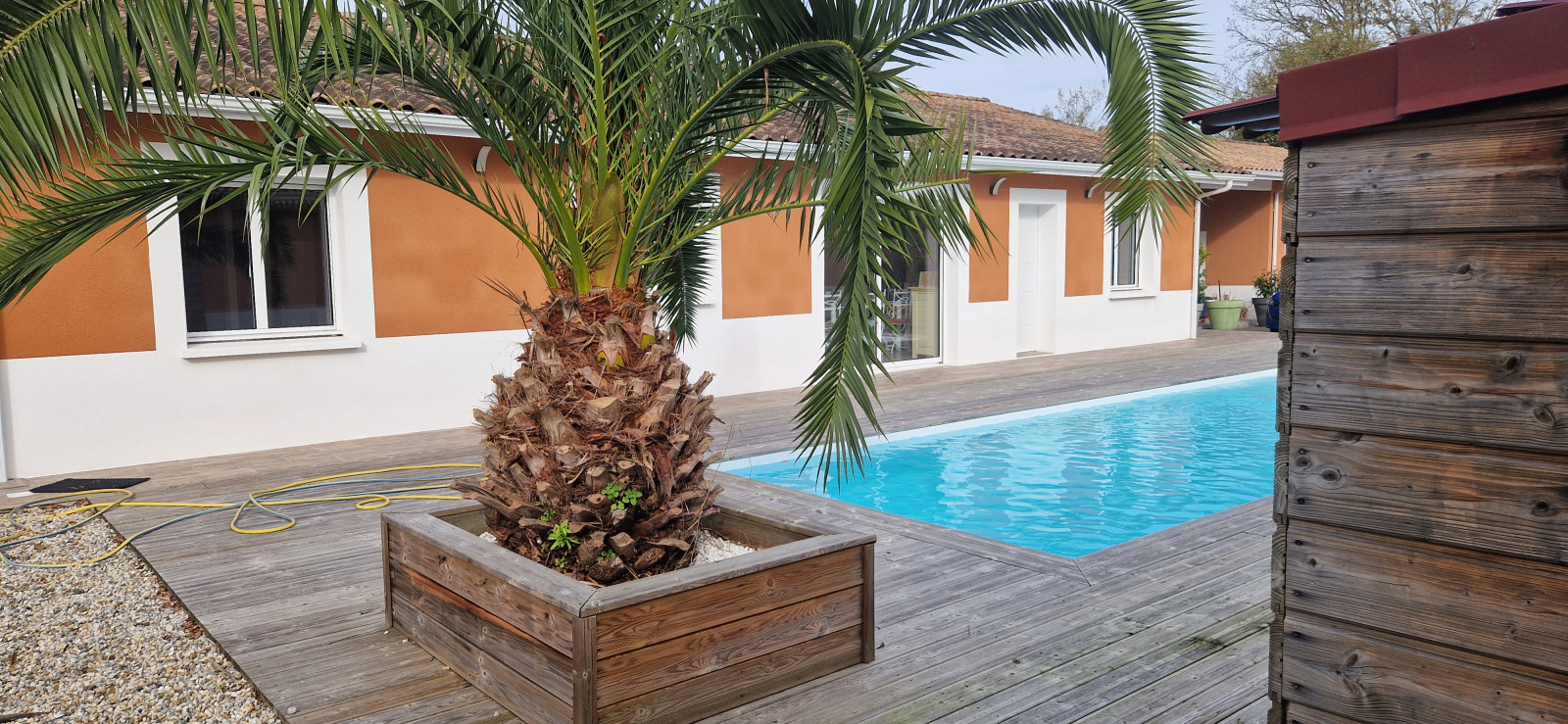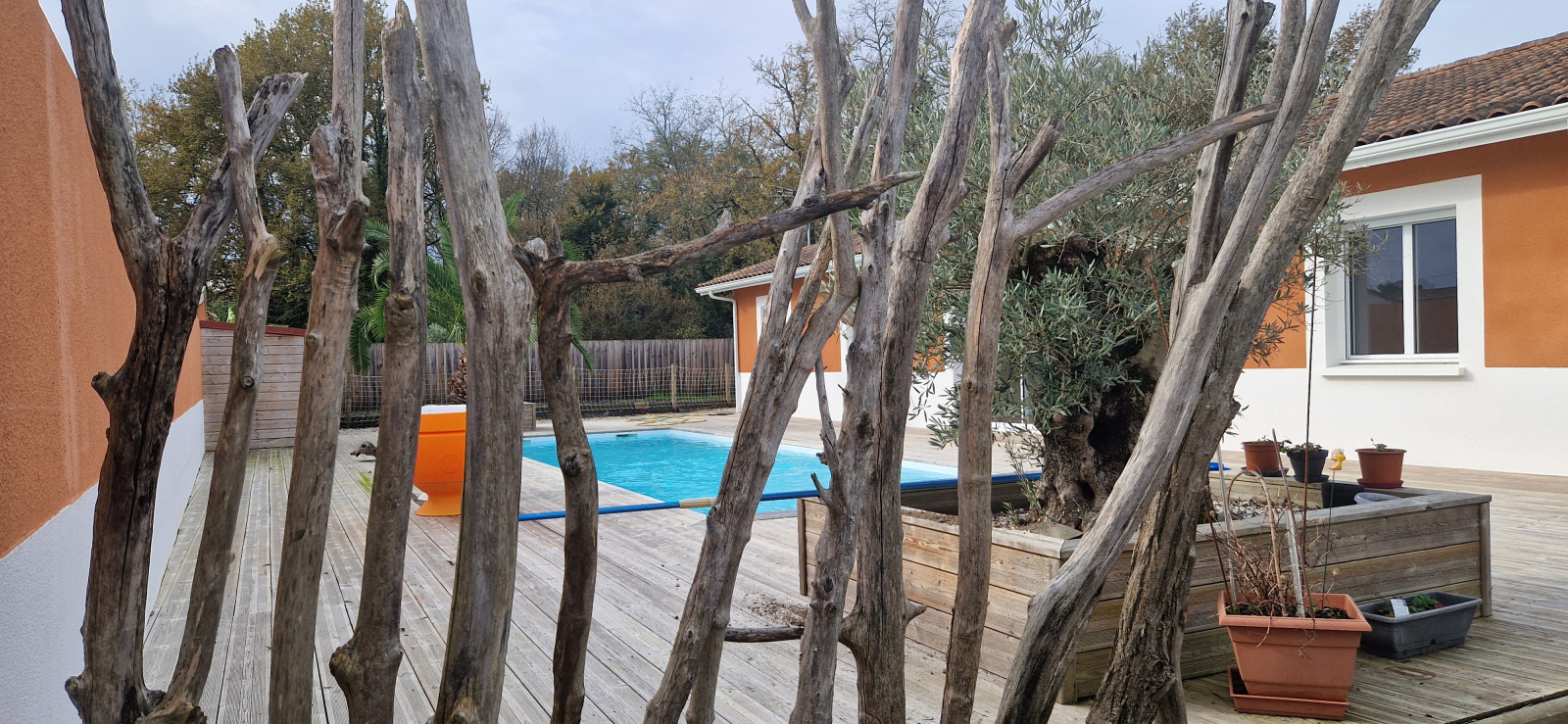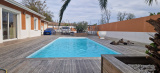 belle maison de plain-pied 145 m² comprenant, un séjour avec cuisine équipée, cellier, dégagement, trois chambres avec placards, salle de bains avec baignoire et douche à l'italienne, WC, terrasse couverte carrelée avec BBQ 70 m², garage double attenant 70 m² plus rochelle 38 m² et cave isolée, piscine avec terrasse bois autour, jardin potager, parking et jardin clos.